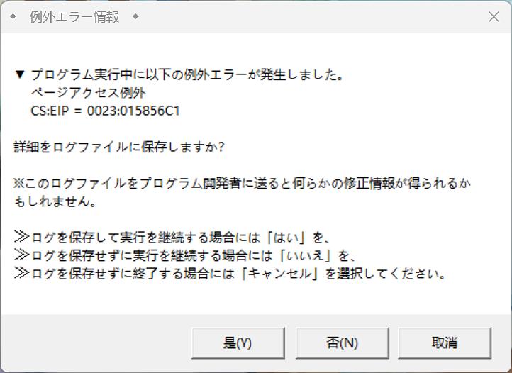 --------------------------- ◆ 例外エラー情報 ◆ --------------------------- ▼ プログラム実行中に以下の例外エラーが発生しました。 ページアクセス例外 CS:EIP = 0023:015856C1 詳細をログファイルに保存しますか? ※このログファイルをプログラム開発者に送ると何らかの修正情報が得られるかもしれません。 ≫ログを保存して実行を継続する場合には「はい」を、 ≫ログを保存せずに実行を継続する場合には「いいえ」を、 ≫ログを保存せずに終了する場合には「キャンセル」を選択してください。 --------------------------- 是(Y) 否(N) 取消 ---------------------------